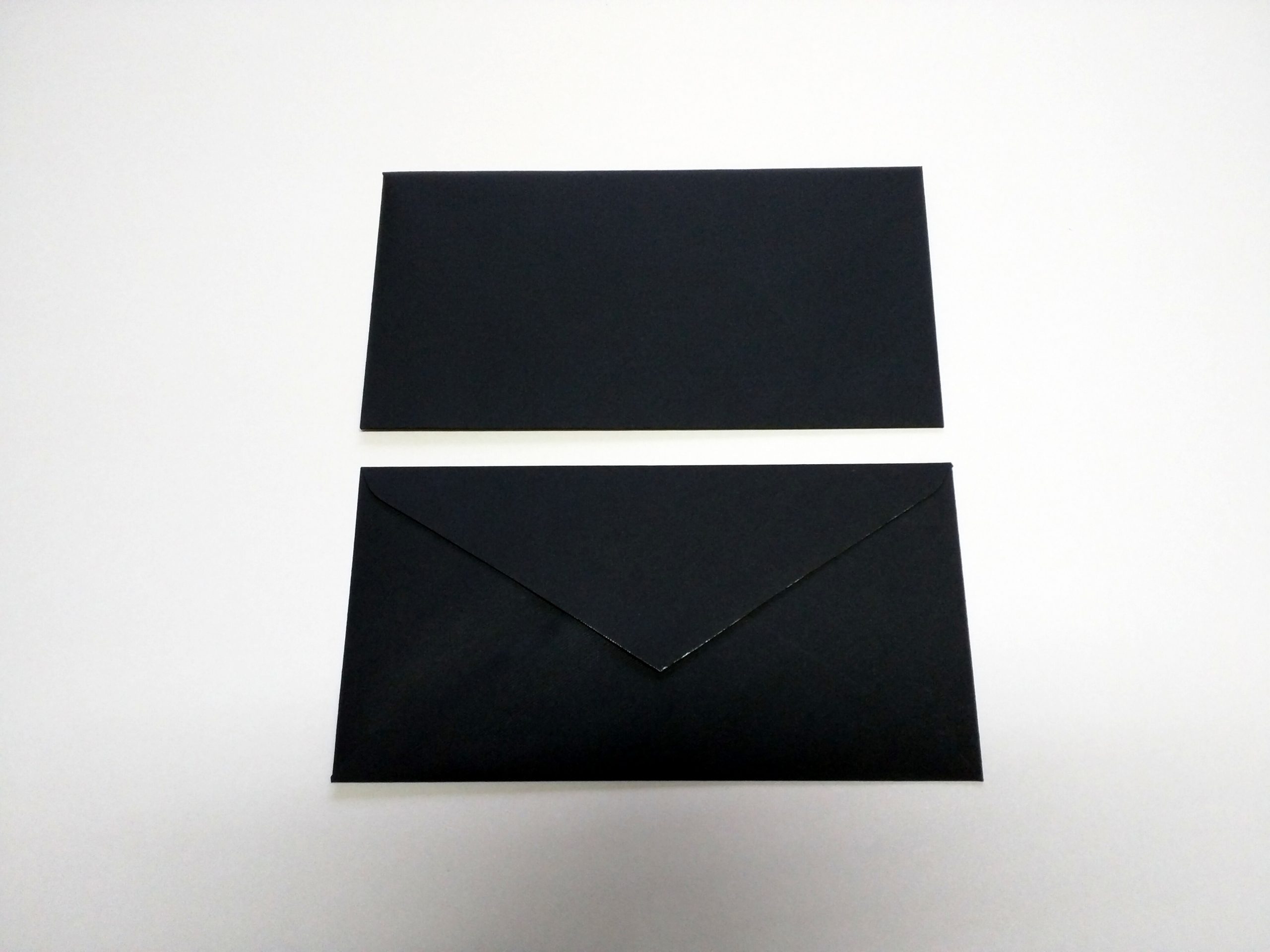 Sobre negro de alto gramaje, tamaño americano de papel verjurado negro y solapa de pico.